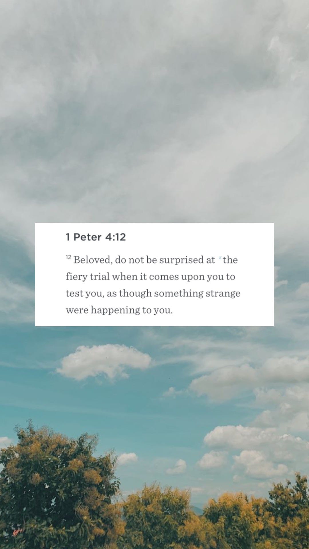 Beloved, do not be surprised at the fiery trial when it comes upon you to test you, as though something strange were happening to you.